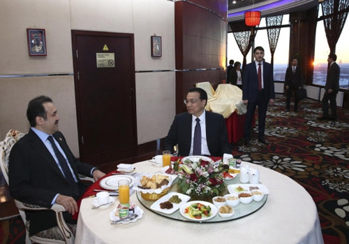 事实上,马西莫夫是带着重大使命来陪中国总理吃这顿早餐的。此前一天,哈总统纳扎尔巴耶夫与李克强的会谈由原定交互传译一小时,变成同声传译一个半小时,彼此间谈得十分投机。哈总统把李克强提出的中国在哈萨克斯坦就地建厂、对接哈国经济发展“光明大道”计划的倡议直接称为“李计划”。当他最终完全了解了中国总理关于加强两国产能合作的出发点和落脚点后,这位中亚地区卓越的政治家一拍桌子,说:“就这么定了!”次日一早,他便派马西莫夫总理来到中国总理下榻的酒店。