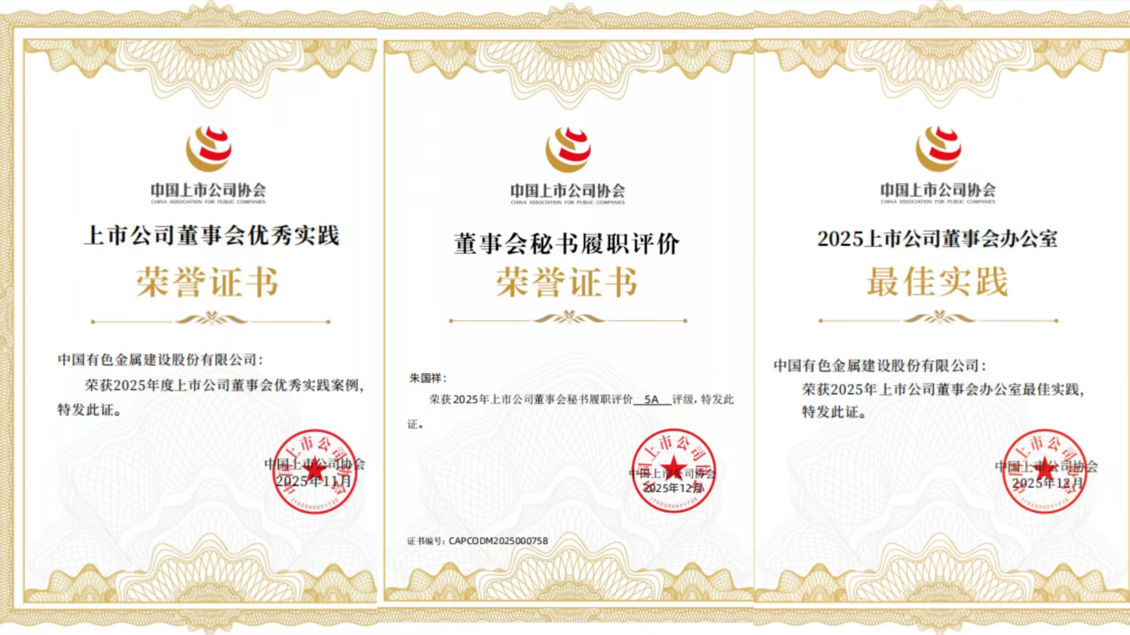 近日,中色股份凭借在公司治理领域的卓越表现,在中国上市公司协会组织的权威评选中连获殊荣,一举摘得“上市公司董事会优秀实践案例”“上市公司董事会秘书5A评级”(最高级)及“上市公司董事会办公室最佳实践案例”(最高级)三项大奖。这标志着公司从董事会领航掌舵、董事会秘书核心履职到董事会办公室专业执行的完整治理链条,均获得了资本市场监管机构与行业的高度评价,展现了公司治理体系和治理效能的先进性与有效性。