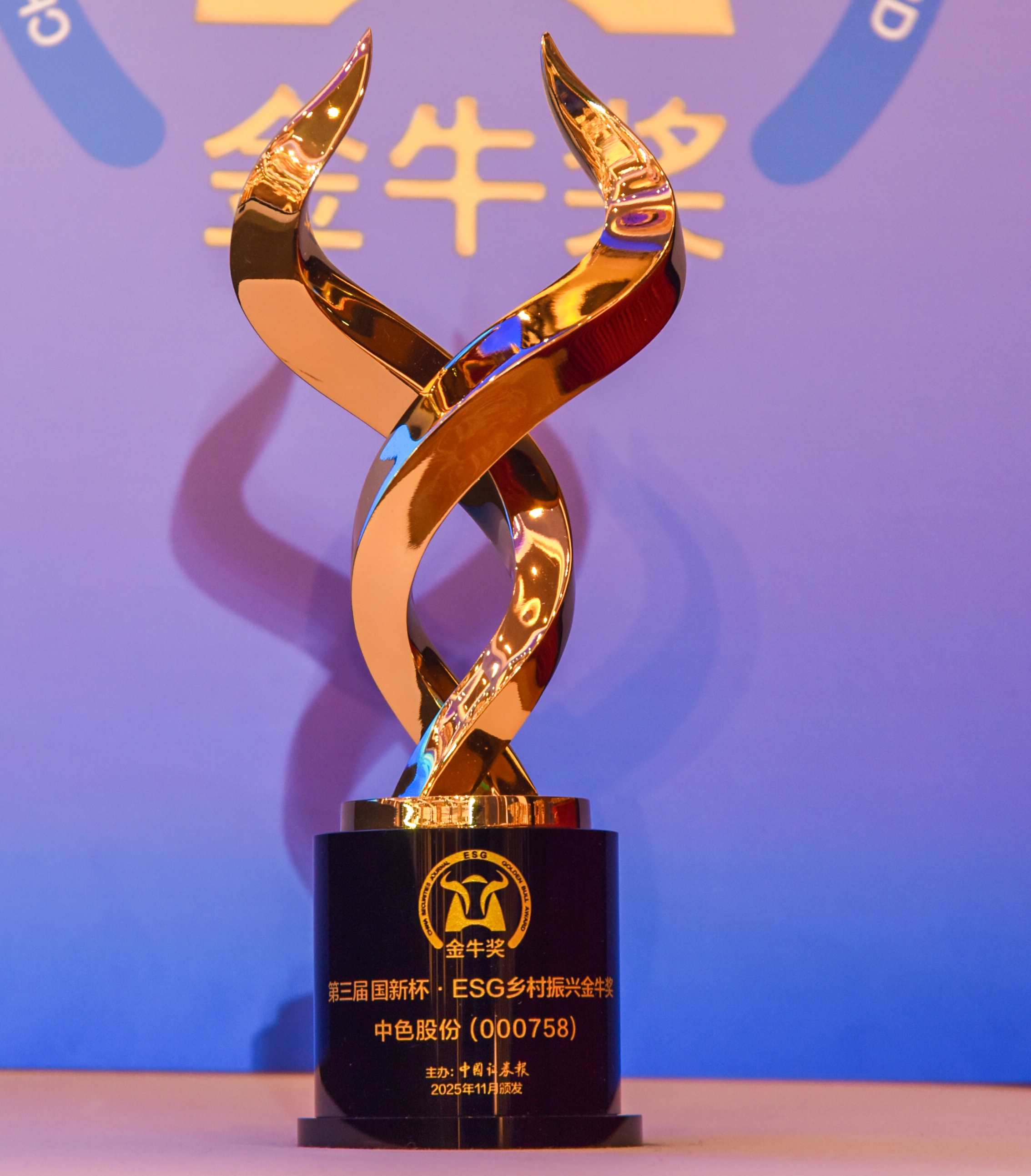 2025年11月26日,由中国证券报、中国国新主办,国新证券承办的2025年金牛企业可持续发展论坛暨第三届国新杯·ESG金牛奖颁奖典礼在苏州举办,中色股份荣获“ESG乡村振兴金牛奖”。本奖项是对中色股份近年来扎实履行社会责任、助力区域协调发展、践行美丽中国建设的充分肯定。